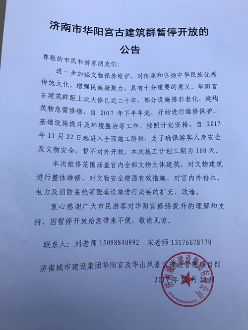 11月22日,因華陽(yáng)宮古建筑群部分設(shè)施陳舊老化,建構(gòu)筑物急需修繕,即日起進(jìn)入全面施工修復(fù)階段。濟(jì)南城市建設(shè)集團(tuán)華陽(yáng)宮及華山風(fēng)景區(qū)建設(shè)管理項(xiàng)目部發(fā)布濟(jì)南市華陽(yáng)宮古建筑群暫停開(kāi)放的公告。
