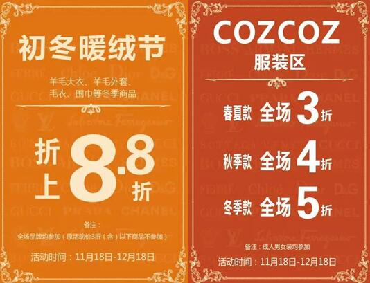 11月18日—12月18日推出“初冬暖絨節(jié)”活動(dòng),羊毛大衣、羊毛外套、毛衣、圍巾等冬季商品折上8.8折優(yōu)惠,cozcoz服裝區(qū)3~5折優(yōu)惠進(jìn)行中。