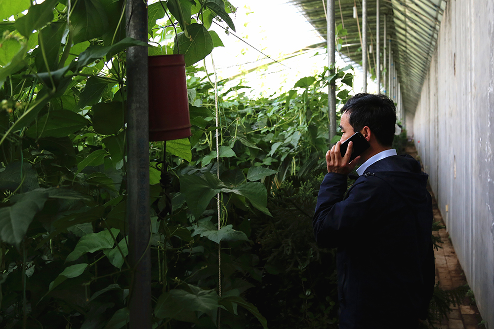 7:30當(dāng)我們到達(dá)陳德國(guó)所在的大棚區(qū)時(shí),他已經(jīng)工作了一個(gè)小時(shí)。“像這種老葉、黃葉要抓緊摘掉了,到了一定年限就只吃飯不干活,影響光合作用。”在蕓豆種植棚,陳德國(guó)正在電話指導(dǎo)著種植戶。
