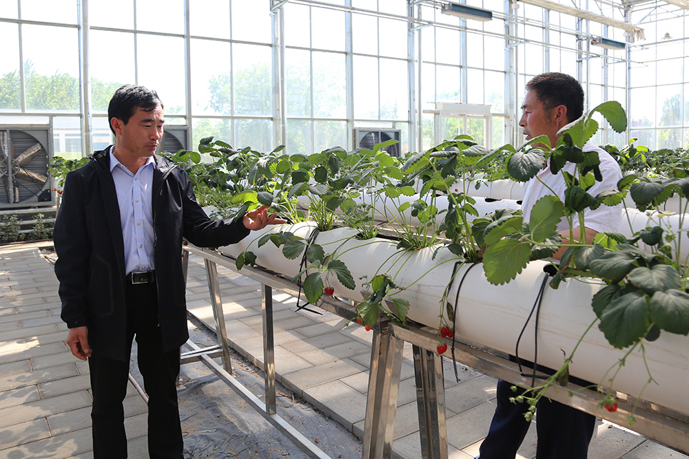 在連棟溫室里,陳德國(guó)察看前期做育苗試驗(yàn)的情況。“草莓在這里第一年的種植效果就很好,原因在于前期我們吸取教訓(xùn),在這些塑料管子下面打孔處理,管內(nèi)放著陶粒和紗窗,給原有設(shè)備增加了透氣性。”陳德國(guó)解釋道。