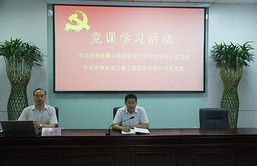 為進(jìn)一步學(xué)習(xí)貫徹落實(shí)黨的十九大精神,深入領(lǐng)會(huì)山東省新舊動(dòng)能轉(zhuǎn)換重大工程會(huì)議要求,激發(fā)廣大黨員干部新時(shí)代新?lián)?dāng)新作為,2018年5月25日下午,濟(jì)南金諾公路工程監(jiān)理有限公司黨支部、濟(jì)南金衢公路勘察設(shè)計(jì)研究有限公司黨支部組織全體黨員、中層及以上干部、積極分子五十余人在金衢公司第一會(huì)議室進(jìn)行黨課學(xué)習(xí)。濟(jì)南金諾公司黨支部書(shū)記、董事長(zhǎng)兼總經(jīng)理馮子強(qiáng),濟(jì)南金衢公司黨支部書(shū)記、董事長(zhǎng)兼總經(jīng)理張建等領(lǐng)導(dǎo)出席學(xué)習(xí)活動(dòng),會(huì)議由濟(jì)南金衢公司張建書(shū)記主持。