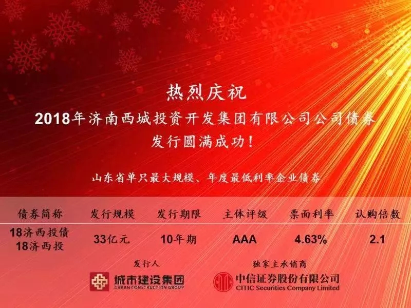 12月14日,濟南城市建設(shè)集團全資子公司濟南西城投資開發(fā)集團有限公司成功發(fā)行33億元企業(yè)債券,共有53家機構(gòu)參與認購,認購倍數(shù)2.1倍,認購總額達到70億元,發(fā)行利率4.63%,期限10年。該筆企業(yè)債券創(chuàng)下多項省市企業(yè)債券發(fā)行之最,是我省2018年規(guī)模最大、本年度利率最低的企業(yè)債券,同時該筆債券融資也是濟南市有史以來獲批最大規(guī)模、今年唯一一筆企業(yè)債券。
