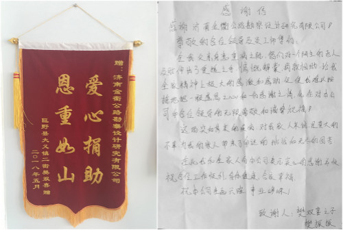 5月24日,菏澤市巨野縣大義鎮(zhèn)二街樊雙喜委托家人專程來到濟南金衢公路勘察設計研究有限公司,將一面寫有“愛心捐助 恩重如山”的錦旗和一封感謝信送到公司工作人員手中,借此表達對濟南金衢公司全體員工對樊雙喜一家及時伸出援助之手、慷慨解囊渡難關的感激之情。