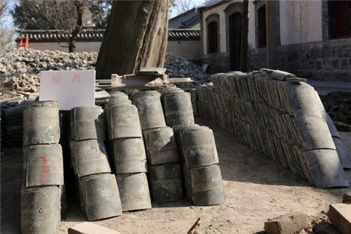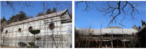 目前,所有古建的勘查檢修工作已經(jīng)完成,年久失修的房頂苫背、望板等已全被撤下,色澤與功能都已陳舊建筑油漆也被逐層敲除,臨時撤下的古磚古瓦、飛檐檁條等都被整齊編號入庫,以作后用。