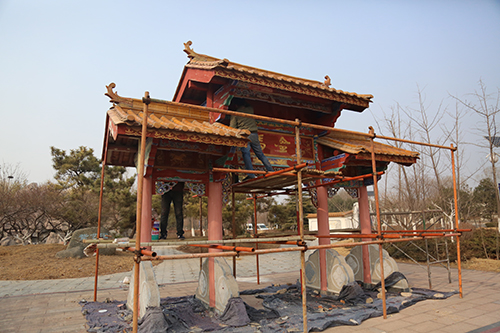 展園內(nèi)仿古彩繪維修項目主要對原有展園仿古建筑中木作油漆和墻面漆脫落、瓦面破損等部位進行維修,提高建筑觀賞性。共需涂刷油漆775平方米、彩畫1013平方米、更換瓦面490平方米、涂刷乳膠漆940平方米等,目前已涂刷仿古彩繪油漆約1990平方米。