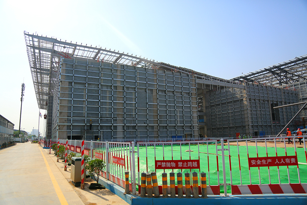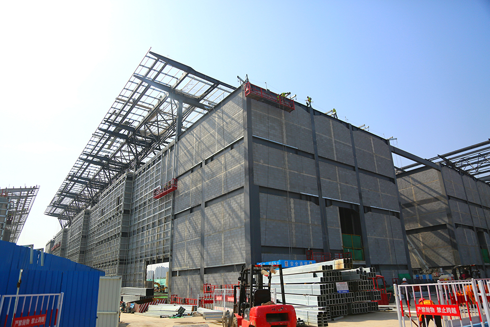 目前,1~3號館展廳部分鋼結(jié)構(gòu)吊裝均接近尾聲,三個展館均在施工各自東側(cè)輔房位置鋼結(jié)構(gòu)吊裝,砌體及樓承桁架板混凝土澆筑部分,進(jìn)行自下而上、自西向東流水施工。預(yù)計2018年8月底1~3號館結(jié)構(gòu)施工完成。