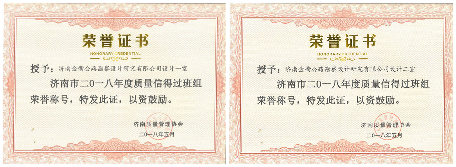 濟南金諾公路工程監(jiān)理有限公司《提高基層水泥穩(wěn)定碎石混合料強度》、《提升橋梁結(jié)構(gòu)物混凝土外觀質(zhì)量合格率》兩項課題榮獲“濟南市2018年度質(zhì)量管理成果一等獎”;《提高新舊路基結(jié)合部路床壓實度》課題榮獲“濟南市2018年度質(zhì)量管理成果三等獎”。