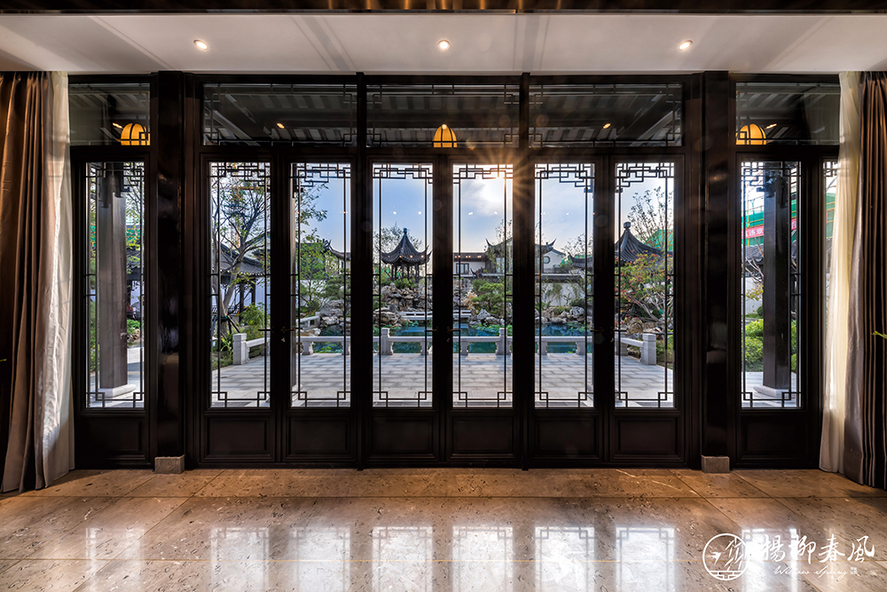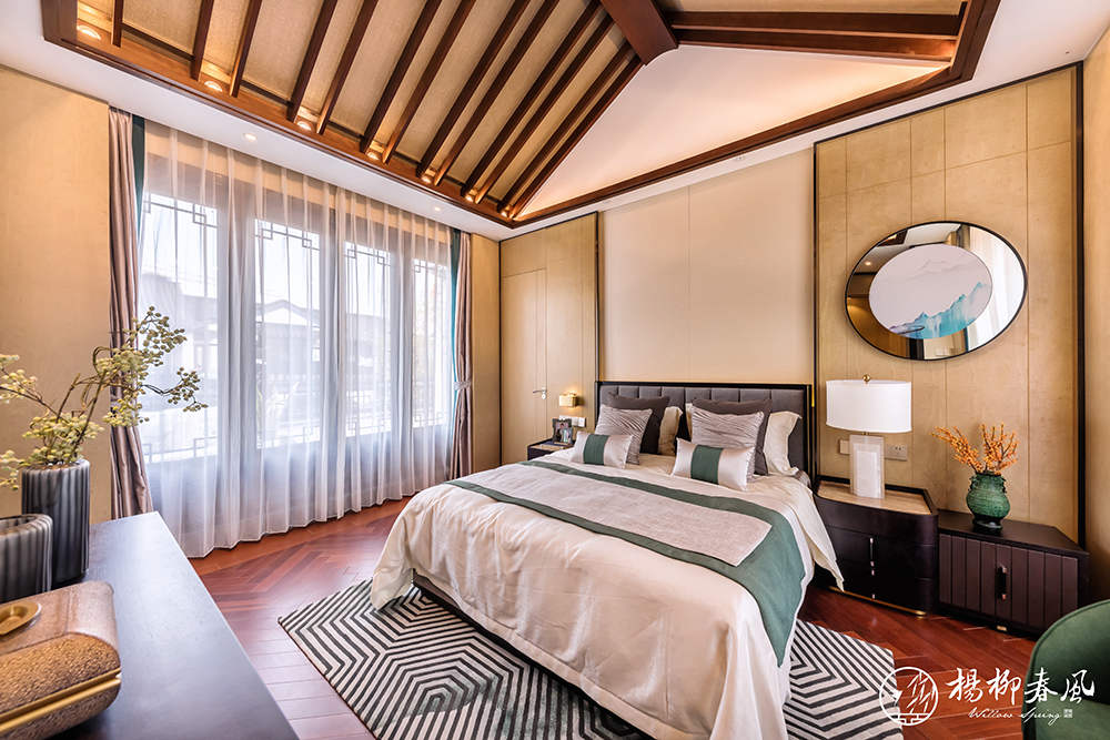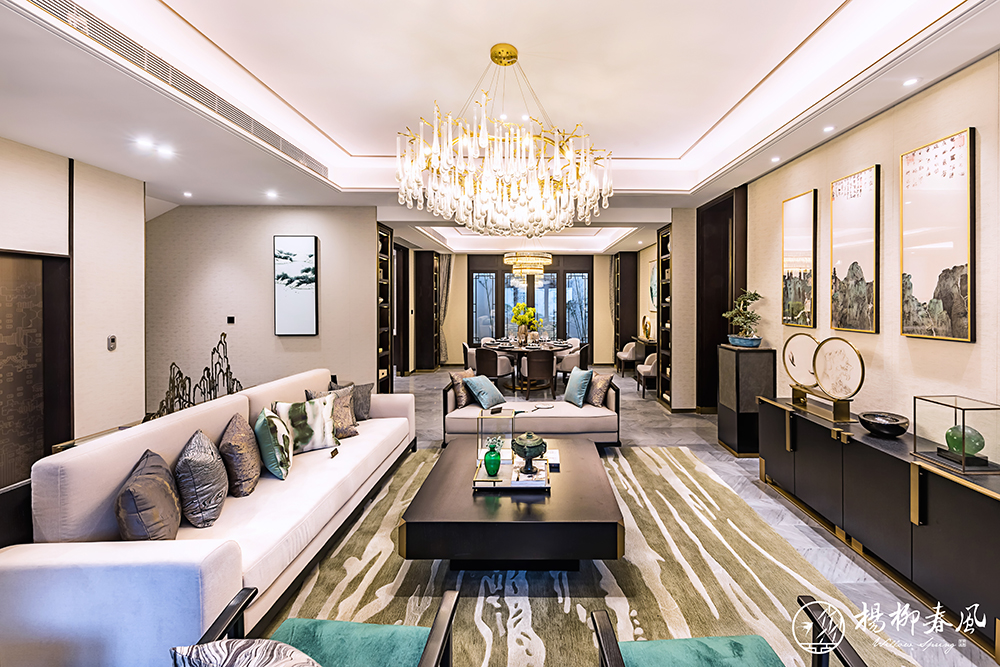另一套大戶型樣板房采用新中式風(fēng)格,以儒家思想為依托,通過(guò)大理石、金屬銅、木材的有機(jī)結(jié)合,體現(xiàn)主人的穩(wěn)重、尊貴和優(yōu)雅。約110㎡的大面積庭院,演繹著四季不落幕的錦繡風(fēng)光;挑高約5.7米的地下空間,讓格調(diào)生活隨心定制。整套樣板房抒寫著文雅靈動(dòng)的東方氣韻,展現(xiàn)了“中正和雅”的國(guó)風(fēng)意境。
