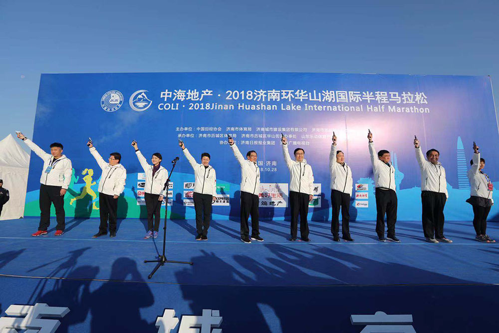 10月28日上午8點,中海地產(chǎn)·2018濟南環(huán)華山湖國際半程馬拉松在濟南華山腳下鳴槍開跑。來自24個省區(qū)市的5000余名跑友以及13名國外選手參賽。山東省體育局局長李政,濟南市委常委、宣傳部部長楊峰,副市長王桂英,歷城區(qū)委書記吳承丙,濟南日報報業(yè)集團董事長馬利,濟南市體育局局長高立文,濟南廣播電視臺臺長孫世會,濟南城市建設集團董事長李國祥等出席開幕式并為開賽鳴槍。