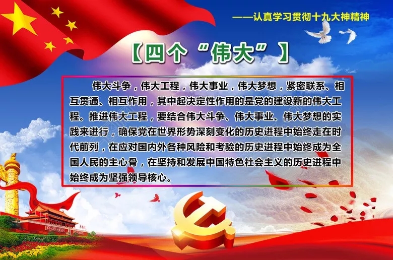 黨的十九大修改黨章明確把統(tǒng)攬“四個偉大”寫了進來,“四個偉大”指的是進行偉大斗爭、建設偉大工程、推進偉大事業(yè)、實現(xiàn)偉大夢想。