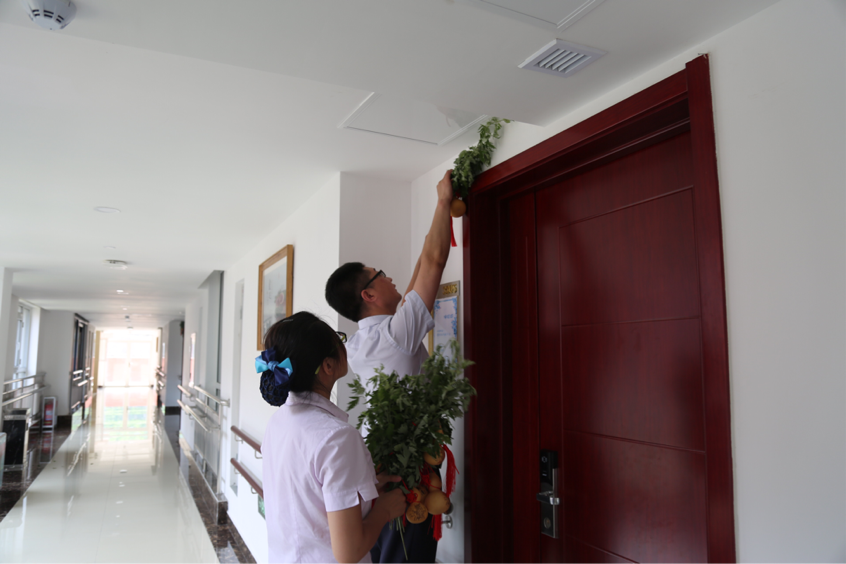 一大早,服務(wù)人員便和老人們一起在門口掛起了艾草和小葫蘆。老人還親手編織了五彩繩,和工作人員們親手系上。