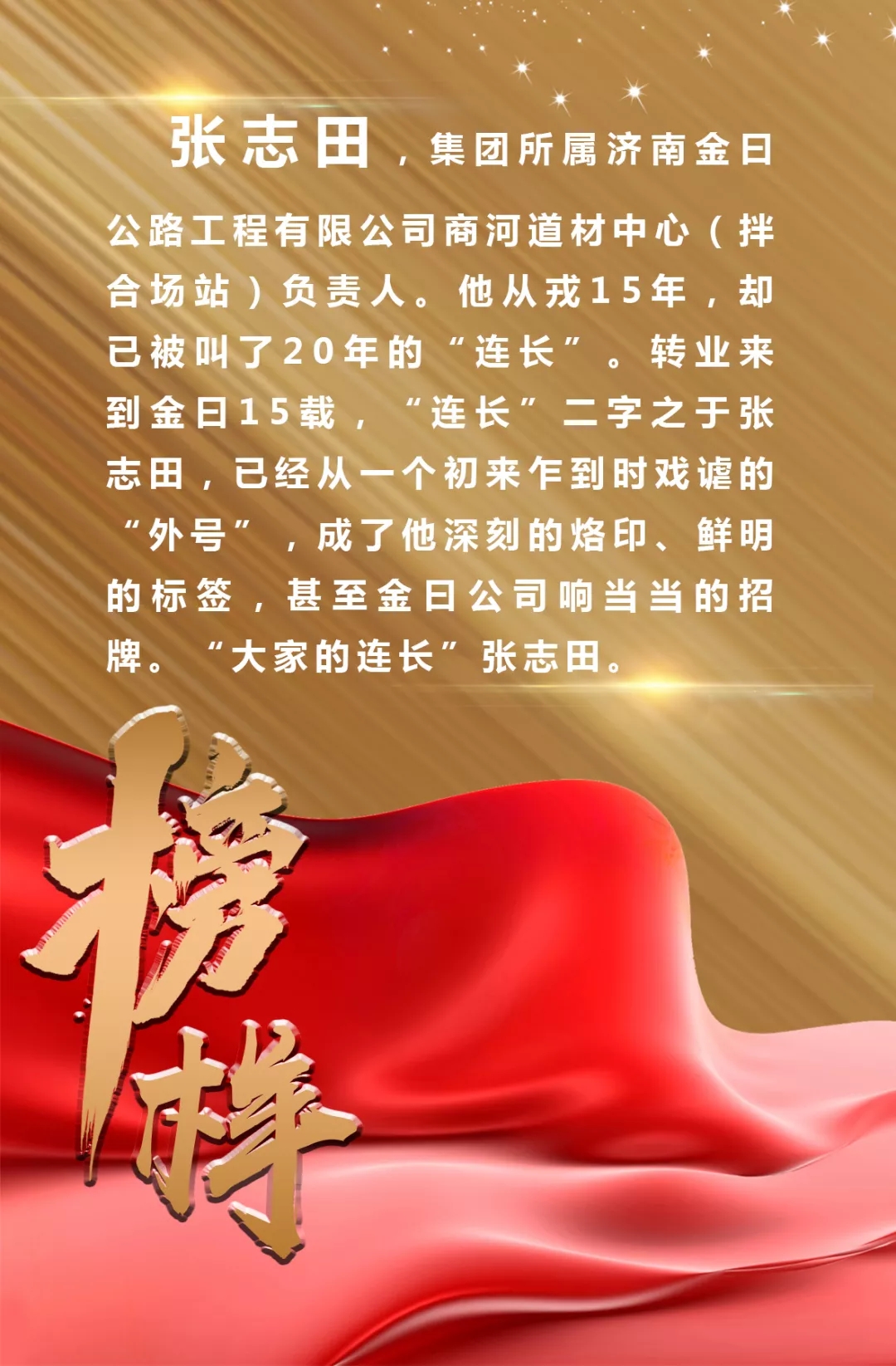 轉(zhuǎn)業(yè)來到金曰后,他主動(dòng)要求到工程建設(shè)一線工作,因?yàn)?ldquo;在辦公室坐不住,在部隊(duì)時(shí)也是這樣”。2005年底,他來到公司濟(jì)菏項(xiàng)目部,報(bào)到的第一天,當(dāng)時(shí)的項(xiàng)目總工劉志民便給他起了“連長”這個(gè)稱呼:“軍轉(zhuǎn)干部很少有人肯到項(xiàng)目一線,這里需要鐵打的軍人作風(fēng),雖然你是營級(jí)干部,但連長更順口,以后就叫你連長吧。”當(dāng)時(shí),正值海棠花開,張志田的辦公桌上放著一盆盛開的海棠花,項(xiàng)目部同事王安娜為他抓拍了一張工作照,把照片投到了公司內(nèi)部報(bào),并為照片命名“連長之花”,自此,張志田“連長”的稱呼便在整個(gè)公司傳了開來。