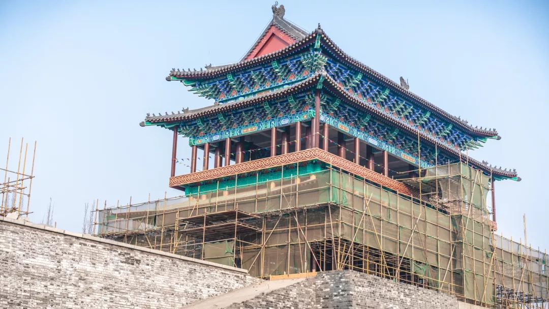 項(xiàng)目所有建筑中,最具標(biāo)志性的當(dāng)屬城門(mén)樓,同時(shí),這也是項(xiàng)目?jī)?nèi)工程量最大、工期最長(zhǎng)的單體建筑。其中城墻高度為8.7米,城門(mén)樓最頂端高度為29.5米。僅城門(mén)樓施工使用的鋼管就已達(dá)20萬(wàn)米,占整個(gè)項(xiàng)目鋼管消耗量的近一半,從基礎(chǔ)施工到主體完工,耗時(shí)近4個(gè)月。城門(mén)樓的彩繪部分采用的是旋子彩繪形式,用或圓潤(rùn)飽滿(mǎn)、或流暢柔韌的各色線(xiàn)條旋轉(zhuǎn)盤(pán)結(jié)而成,最大的特點(diǎn)是在藻頭內(nèi)使用了帶卷渦紋的花瓣,旋子常用于殿式彩畫(huà),既素雅又華美。