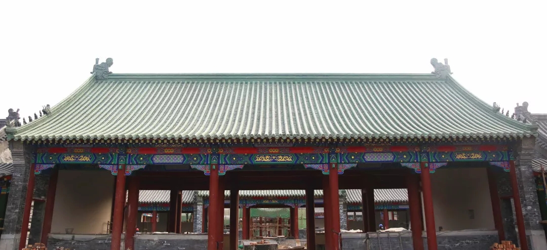 項(xiàng)目中仿古建筑的涂刷油漆部分做地仗都是采用“豬血+桐油”的古法油漆(“地仗”是一種采用“一麻五灰”的古老傳統(tǒng)工藝的施工做法)。仿古地仗油漆成活一般需要基層處理、下竹釘、捉縫灰、通灰、裹布等12道工序。清代彩繪的種類(lèi)非常豐富,從紋飾的主體框架構(gòu)圖和題材方面分類(lèi)可分五大類(lèi):和璽類(lèi)、旋子類(lèi)、蘇式類(lèi)、海墁類(lèi)和吉祥草類(lèi)。“親王府”區(qū)域的建筑彩繪主要采用了三種繪畫(huà)形式,王府中軸線(xiàn)上建筑部分采用旋子墨線(xiàn)小點(diǎn)金彩繪,體現(xiàn)為輪廓線(xiàn)均用墨線(xiàn),花心點(diǎn)金的形式;配房部分采用雅伍墨旋子彩繪,指完全不用金,線(xiàn)條用墨,旋子用藍(lán)、綠、白、黑四色,花瓣不起暈;長(zhǎng)廊與園林部分的小型建筑部分采用蘇式彩繪,蘇式彩繪畫(huà)面內(nèi)容豐富,自然山水、花鳥(niǎo)魚(yú)蟲(chóng)、各式人物一應(yīng)俱全。彩繪待地仗完成后還需依次為:丈量起譜子、刷生油、磨平、過(guò)水布、分中、打普子、瀝大小粉等13道工序。
