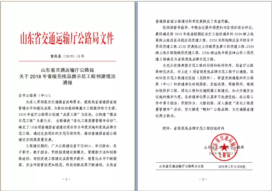 由濟(jì)南城市建設(shè)集團(tuán)所屬金諾公司負(fù)責(zé)代建管理、金衢公司負(fù)責(zé)設(shè)計(jì)、金曰等公司參與建設(shè)的G220東鄭線陶莊至平陰東平界段改建工程(簡稱“G220平陰南段改建工程”)喜獲山東省交通運(yùn)輸廳公路局“2018年省級(jí)亮線品牌示范工程”榮譽(yù)稱號(hào)。