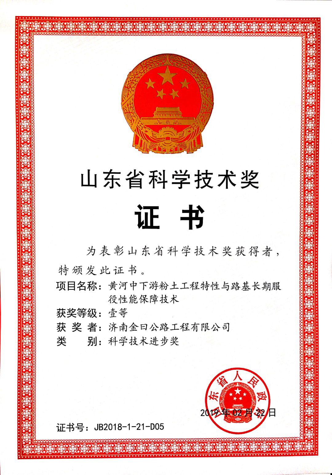 金曰公司長期致力于科研工作的開展,積極促進科研成果轉化落地,近年來,陸續(xù)與山東大學、長安大學、山東建筑大學、山東交通學院等多所科研院校和研究單位建立了產學研合作基地,先后申報科研課題12項,主持和參與編制山東省地方標準2項,獲得中國公路學會科學技術一等獎1項,山東省科技進步一等獎1項,申請發(fā)明專利2項、實用新型專利16項、工法9項,發(fā)表論文26篇,多數成果在工程項目中取得了應用,形成經濟效益數千萬元。多年來,公司承攬的多項重點工程項目先后榮獲魯班獎、泰山杯等獎項。