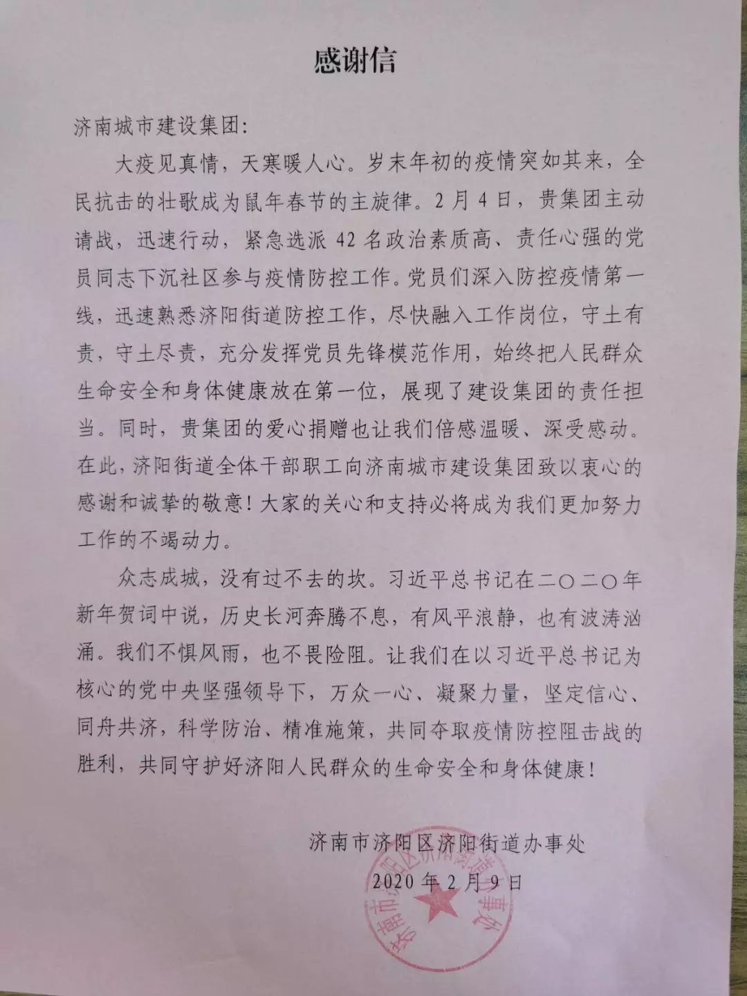 濟陽街道辦事處專門給集團寫了感謝信,濟陽街道康瑞社區(qū)與雅居園物業(yè)管理有限公司還向呂仁鎮(zhèn)、齊鵬飛兩名黨員同志贈送了寫有“抗擊疫情勇?lián)?,志愿服務爭先鋒”的錦旗。