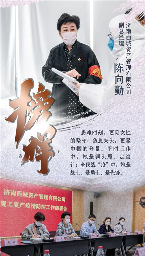目前,濟(jì)南全面復(fù)工復(fù)產(chǎn),陳向勤對疫情防控工作進(jìn)行再部署、再強(qiáng)調(diào)、再落實,做到“十個一律”、“十個嚴(yán)禁”。她提前出手、摸底調(diào)查,切實堅守聯(lián)防聯(lián)控嚴(yán)密防線,幫助運(yùn)營單位制定應(yīng)對措施,關(guān)鍵時刻施以援手,保障復(fù)工復(fù)產(chǎn)后資產(chǎn)管理公司所轄寫字樓、商業(yè)綜合體的疫情防控工作萬無一失。