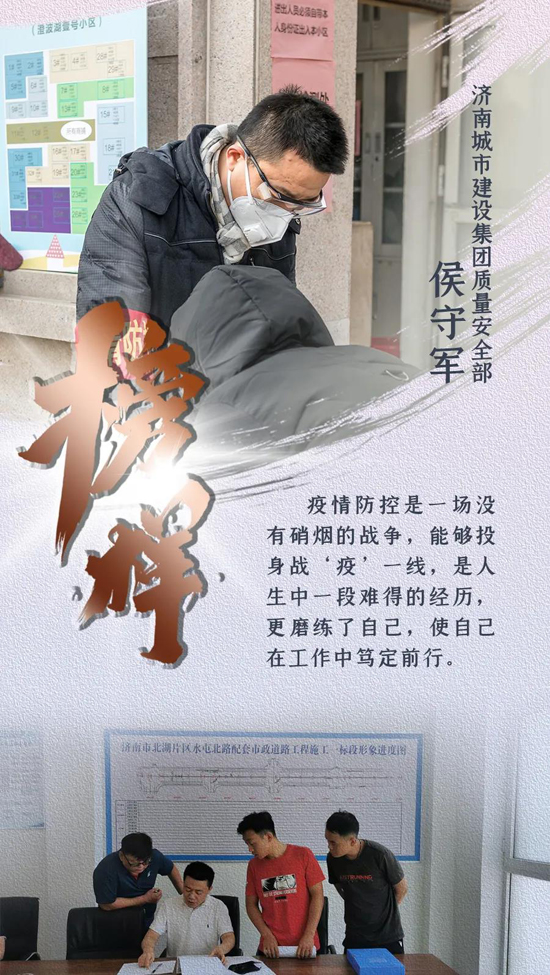 新型冠狀病毒肺炎疫情發(fā)生以來,濟(jì)南城市建設(shè)集團(tuán)認(rèn)真貫徹落實(shí)中央、省、市關(guān)于疫情防控和復(fù)工復(fù)產(chǎn)的決策部署,上下一心、眾志成城,全體干部職工恪盡職守、扎根一線,全員全力投入到疫情防控阻擊戰(zhàn)中。期間,涌現(xiàn)出了眾多先進(jìn)典型和感人故事,用實(shí)際行動(dòng)詮釋了建設(shè)集團(tuán)人的精神風(fēng)貌和責(zé)任擔(dān)當(dāng)。我們?cè)诩瘓F(tuán)宣傳平臺(tái)《榜樣》欄目,推出系列人物報(bào)道,挖掘宣傳一線典型,提振士氣、凝聚力量,激勵(lì)我們繼續(xù)前行,堅(jiān)決打贏疫情防控的人民戰(zhàn)爭、總體戰(zhàn)、阻擊戰(zhàn)。