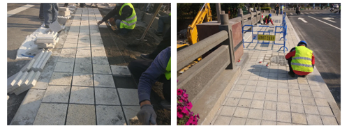 人行道花磚嚴(yán)格掛線施工,砂漿鋪設(shè)飽滿,勾縫細(xì)致。