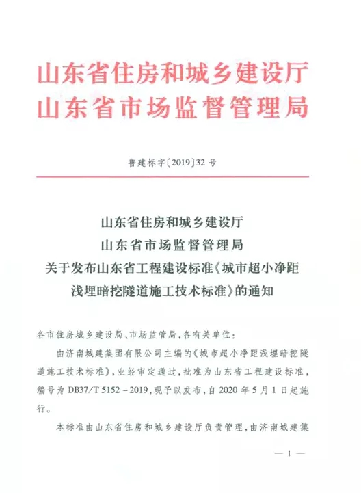 近日,山東省住房和城鄉(xiāng)建設(shè)廳與山東省市場(chǎng)監(jiān)督管理局聯(lián)合下發(fā)魯建標(biāo)字[2019]32號(hào)文《關(guān)于發(fā)布山東省工程建設(shè)標(biāo)準(zhǔn)〈城市超小凈距淺埋暗挖隧道施工技術(shù)標(biāo)準(zhǔn)〉的通知》,宣布由城建集團(tuán)主編的該標(biāo)準(zhǔn)業(yè)經(jīng)審定通過(guò),批準(zhǔn)為山東省工程建設(shè)標(biāo)準(zhǔn),編號(hào)為DB37/T 5152-2019,予以發(fā)布,自2020年5月1日起施行。這是城建集團(tuán)主編并已發(fā)布的第九部山東省工程建設(shè)標(biāo)準(zhǔn),對(duì)省內(nèi)隧道施工起到了一定的規(guī)范指導(dǎo)作用。