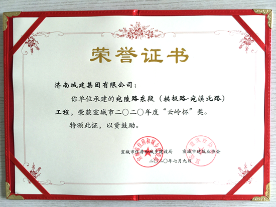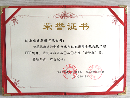 近日,由集團(tuán)所屬濟(jì)南城建集團(tuán)有限公司承建的宣城市水陽(yáng)江大道閉合段北段工程PPP項(xiàng)目、宛陵?yáng)|路(拱極路—宛溪北路)工程榮獲宣城市2020年度“云嶺杯”獎(jiǎng)。