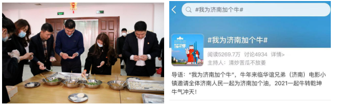 2021春節(jié)期間,華誼兄弟(濟(jì)南)電影城投資開發(fā)有限公司開展了年終總結(jié)表彰會、包餃子迎新年、我為濟(jì)南加個牛等一系列新春活動,喜迎牛年新春佳節(jié)的到來,營造了喜慶祥和的節(jié)日氛圍。