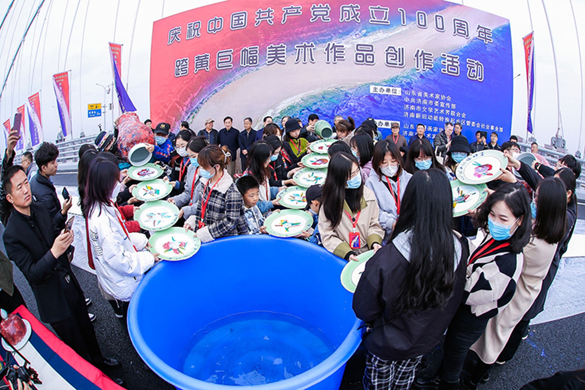 為助力黃河重大國(guó)家戰(zhàn)略實(shí)施,在新時(shí)代現(xiàn)代化強(qiáng)省會(huì)建設(shè)和服務(wù)全市改革發(fā)展大局中彰顯文化擔(dān)當(dāng),11月6日,山東省美術(shù)家協(xié)會(huì)、中共濟(jì)南市委宣傳部、濟(jì)南市文學(xué)藝術(shù)界聯(lián)合會(huì)、濟(jì)南新舊動(dòng)能轉(zhuǎn)換起步區(qū)管委會(huì)社會(huì)事業(yè)部在濟(jì)南鳳凰黃河大橋聯(lián)合組織舉辦慶祝中國(guó)共產(chǎn)黨成立100周年跨黃巨幅美術(shù)作品創(chuàng)作活動(dòng)?;顒?dòng)旨在進(jìn)一步保護(hù)、傳承和弘揚(yáng)黃河文化,深入挖掘黃河文化的時(shí)代價(jià)值,以優(yōu)秀的藝術(shù)作品記錄新時(shí)代、謳歌新時(shí)代,為“文化濟(jì)南”建設(shè)貢獻(xiàn)文藝力量。