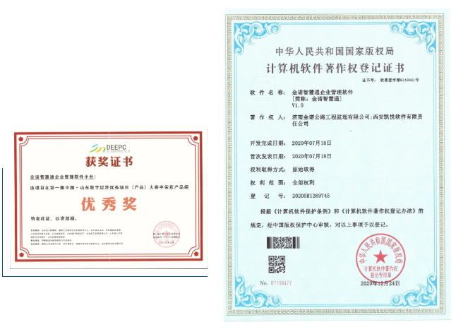 2020年,金諾公司與西安凱悅軟件有限責任公司合作,研發(fā)了“金諾智慧通”企業(yè)管理軟件,于2020年12月取得中國版權(quán)保護中心頒發(fā)的軟件著作權(quán)登記證書。“金諾智慧通”參加了第一屆中國(山東)數(shù)字經(jīng)濟優(yōu)秀項目(產(chǎn)品)大賽,并獲得產(chǎn)品組“優(yōu)秀獎”。同時,2020年下半年推動的針對公路工程建設開發(fā)的“路面三維剖面破損(病害)自動檢測系統(tǒng)”、“橋梁在線監(jiān)測系統(tǒng)”等8個軟件已申報軟件著作權(quán)登記,軟件著作權(quán)登記證書已于2021年3月份下發(fā)。