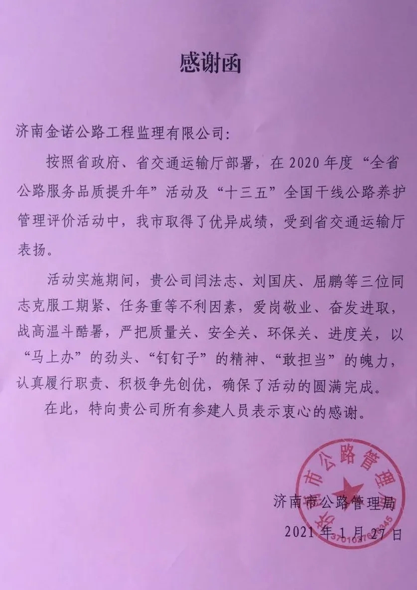 近日,濟(jì)南市公路管理局向金諾公司發(fā)來了《感謝函》,向金諾公司所有參建人員在2020年度“全省公路服務(wù)品質(zhì)提升年”活動(dòng)及“十三五”全國(guó)干線公路養(yǎng)護(hù)管理評(píng)價(jià)活動(dòng)中,認(rèn)真履行職責(zé)、積極爭(zhēng)先創(chuàng)優(yōu)的工作作風(fēng)表示感謝。