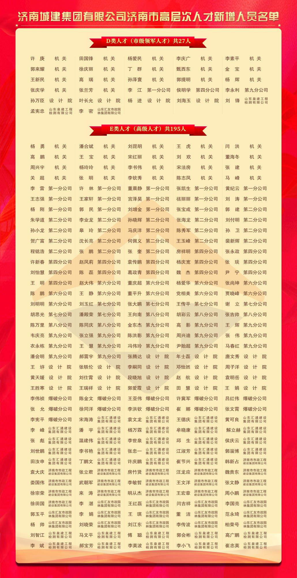 近期,濟(jì)南市高層次人才分類(lèi)認(rèn)定2020年第五批審核結(jié)果公布,城建集團(tuán)新增市級(jí)領(lǐng)軍人才(D類(lèi))27人,高級(jí)人才(E類(lèi))195人。