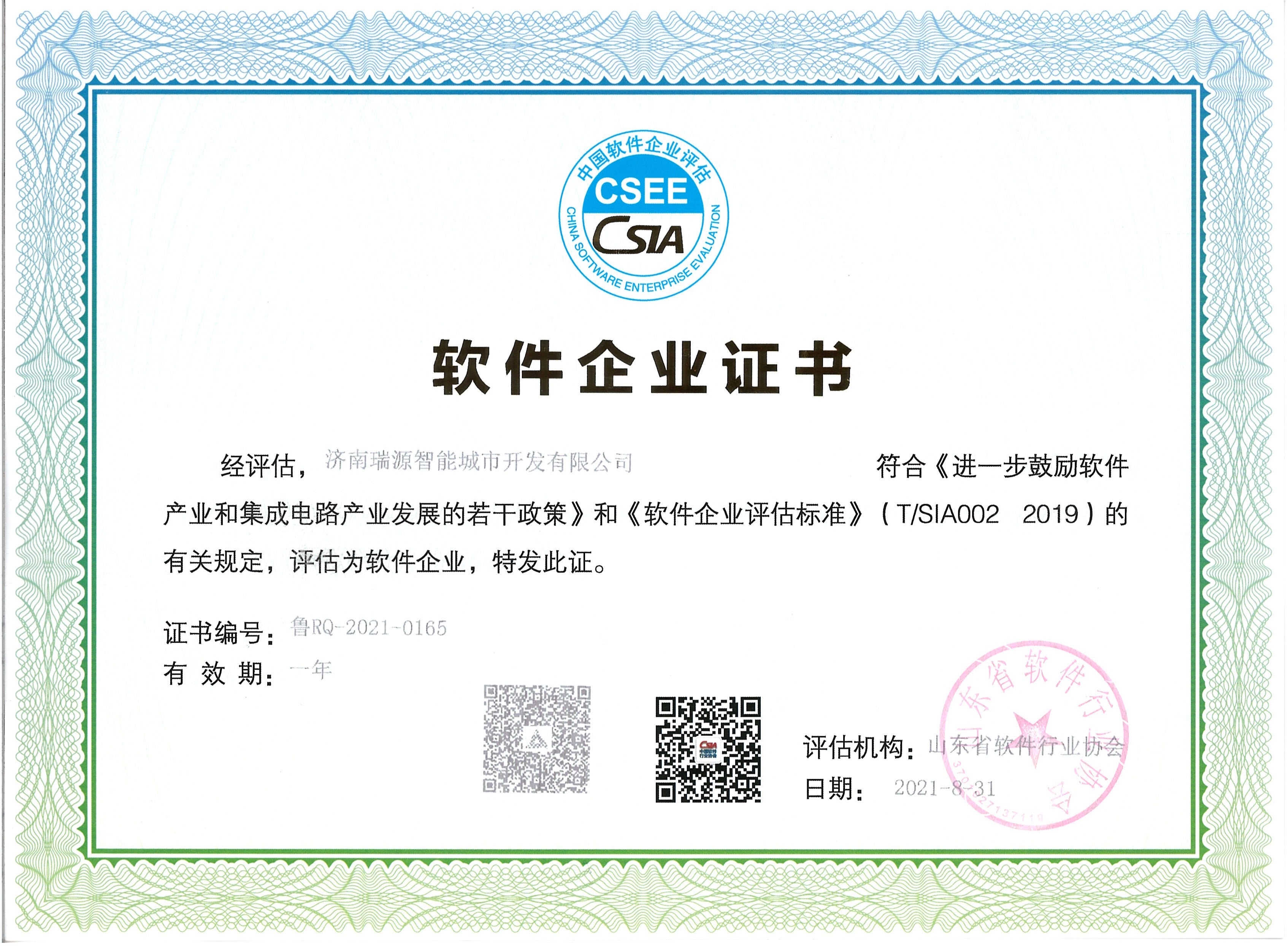 8月31日,濟(jì)南瑞源智能城市開發(fā)有限公司經(jīng)山東省軟件行業(yè)協(xié)會評估,符合《進(jìn)一步鼓勵軟件產(chǎn)業(yè)和集成電路產(chǎn)業(yè)發(fā)展的若干政策》和《軟件企業(yè)評估標(biāo)準(zhǔn)》的有關(guān)規(guī)定,獲評軟件企業(yè)證書。此證書獲得,標(biāo)志著公司在技術(shù)研發(fā)、軟件應(yīng)用等相關(guān)領(lǐng)域獲得了行業(yè)認(rèn)證資質(zhì),更是對公司技術(shù)先進(jìn)性和前沿性的充分認(rèn)可。