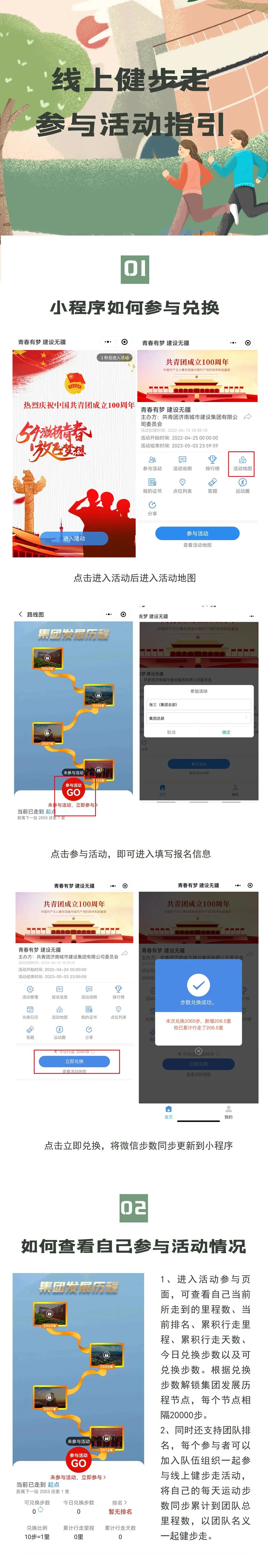 為慶祝建團(tuán)100周年,開展好“百年崢嶸、初心不改、青春與共、砥礪前行”主題教育實(shí)踐活動(dòng),展現(xiàn)集團(tuán)自成立以來的光輝歷程,賡續(xù)集團(tuán)紅色精神、凝聚集團(tuán)奮進(jìn)力量,不斷增強(qiáng)廣大職工的身體素質(zhì)和健康水平,不斷提高集團(tuán)的凝聚力和向心力。由共青團(tuán)濟(jì)南城市建設(shè)集團(tuán)有限公司委員會(huì)主辦,共青團(tuán)濟(jì)南金曰公路工程有限公司委員會(huì)、濟(jì)南新城文化傳媒有限公司承辦的“青春有夢(mèng) 建設(shè)無疆”——職工線上健步走活動(dòng)將于今晚零點(diǎn)正式上線,活動(dòng)時(shí)間為2022年4月25日——5月3日(共十天)。
