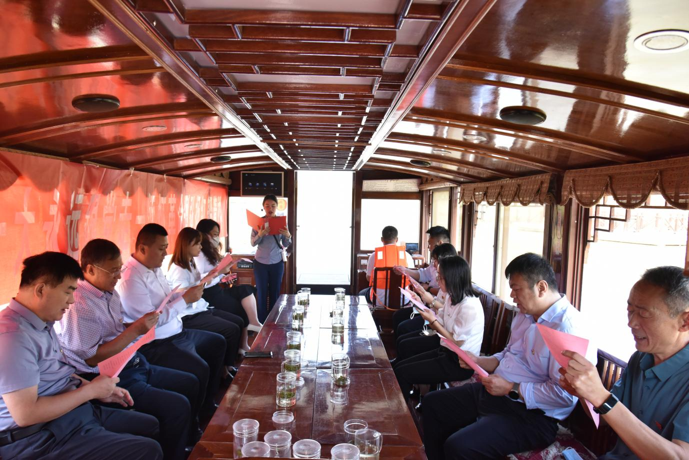 活動中,黨員干部模擬再現(xiàn)嘉興南湖紅船會議場景,圍繞“喜迎二十大 永遠(yuǎn)跟黨走——緬懷革命先烈 弘揚(yáng)紅船精神 ”主題開展朗誦活動。