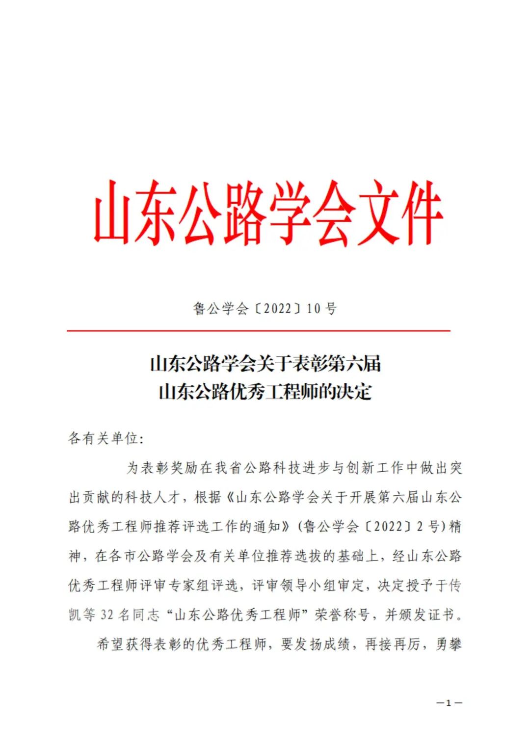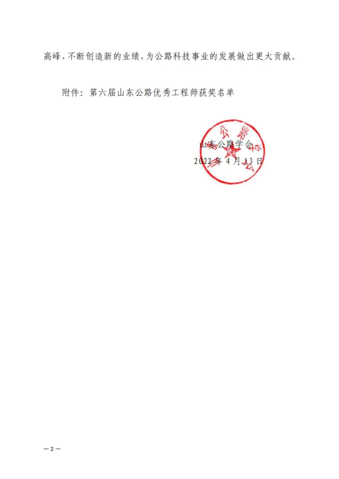 “山東公路優(yōu)秀工程師”評(píng)選活動(dòng)由山東公路學(xué)會(huì)組織,每年在全省范圍內(nèi)評(píng)選一次,旨在激勵(lì)廣大公路交通科技工作者積極投身山東公路事業(yè),發(fā)揚(yáng)創(chuàng)新、求實(shí)、協(xié)作、奉獻(xiàn)精神,推動(dòng)山東省公路交通科技進(jìn)步和創(chuàng)新。