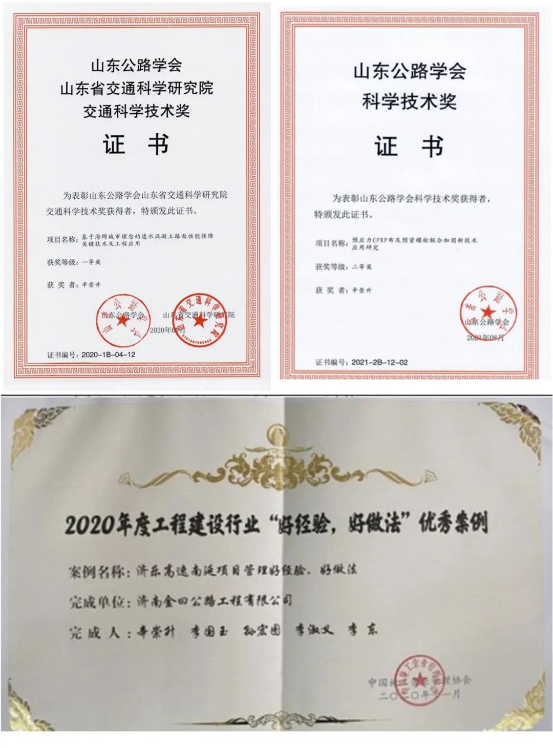 近年來(lái),辛崇升同志先后取得了一級(jí)建造師(公路、市政)、試驗(yàn)工程師(公路、材料、橋梁、隧道)、注冊(cè)安全工程師等執(zhí)業(yè)證書。經(jīng)過(guò)多年的施工技術(shù)管理積累,先后將國(guó)內(nèi)外先進(jìn)技術(shù)(橋梁頂升、數(shù)控智能張拉、鋼管混凝土施工等)應(yīng)用于建設(shè)中,并撰寫了國(guó)家及省級(jí)工法,申報(bào)專利8項(xiàng),撰寫論文5篇,獲得山東公路學(xué)會(huì)科學(xué)技術(shù)獎(jiǎng)2項(xiàng)。