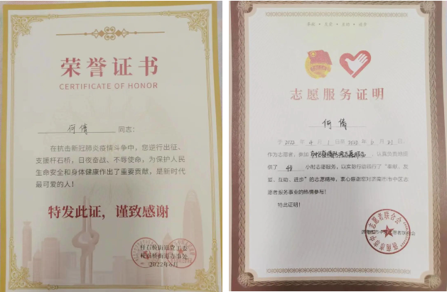 在疫情防控期間,何倩主動(dòng)請(qǐng)纓,逆行出征,協(xié)助桿石橋街道完成核酸檢測、物資搬運(yùn)等疫情防控工作,得到了社區(qū)的高度認(rèn)可。