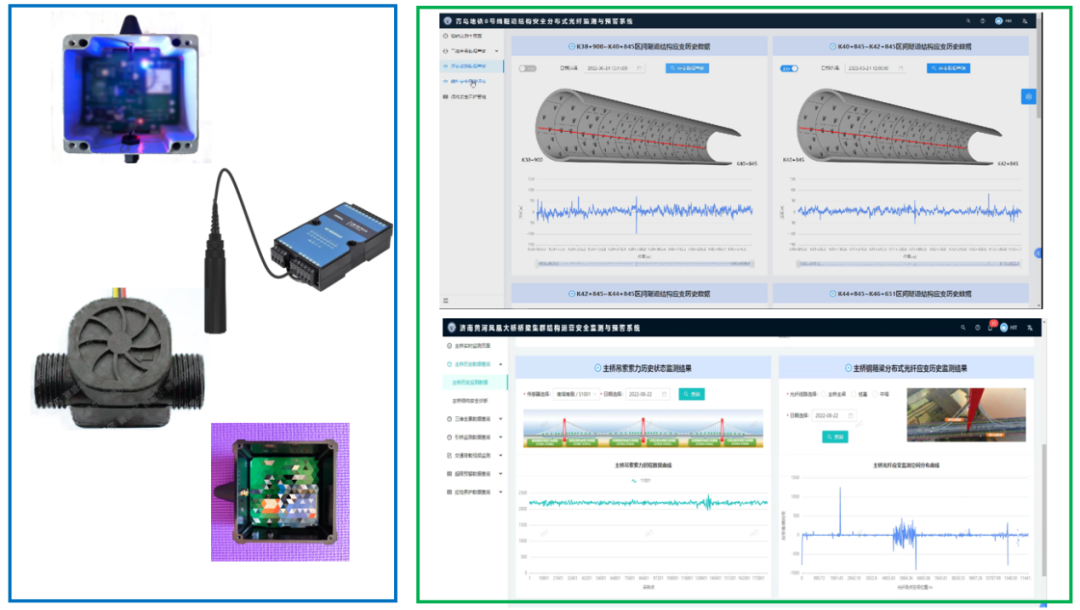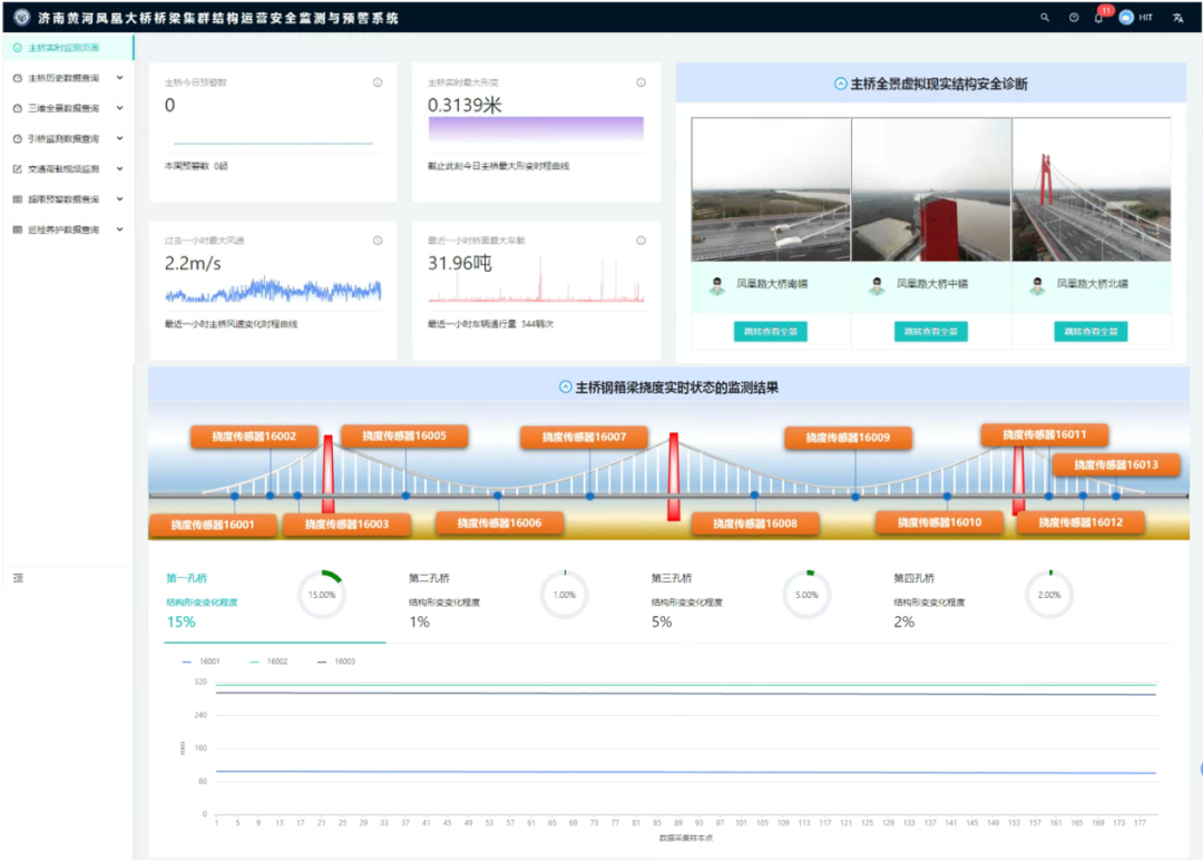 同樣,在濟南黃河鳳凰大橋也搭建了“橋梁集群結(jié)構(gòu)運營安全監(jiān)測與預(yù)警系統(tǒng)”,利用分布式布里淵光纖傳感技術(shù),建立橋梁集群結(jié)構(gòu)應(yīng)變傳感網(wǎng)絡(luò),利用點式傳感技術(shù),監(jiān)測橋梁集群結(jié)構(gòu)響應(yīng)與環(huán)境荷載信息。