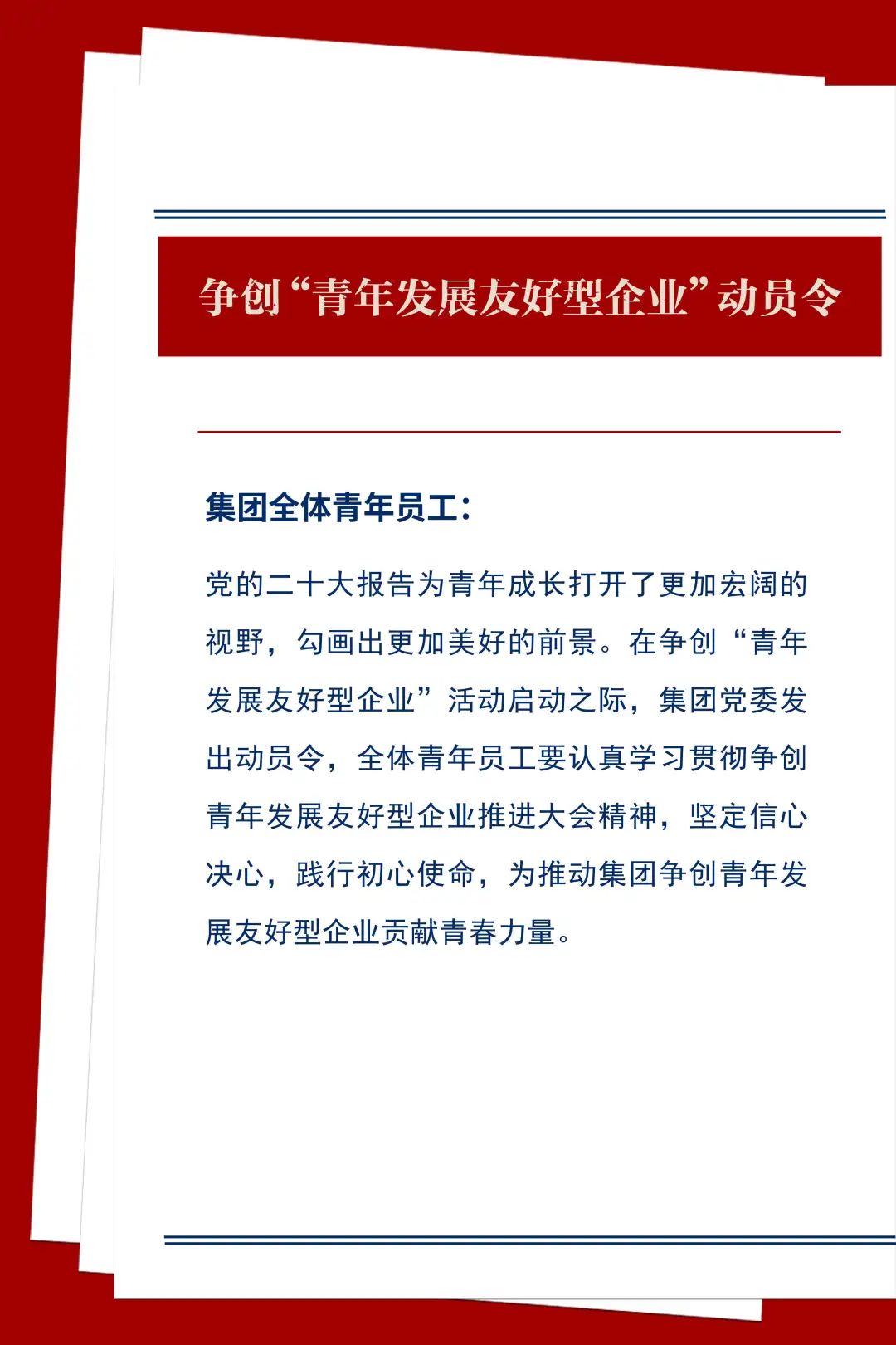 全體青年員工要以對黨和集團高度負責的精神對待本職工作,主動深入一線,切實發(fā)揮青年人朝氣蓬勃的精神和干勁。進一步強化黨建、團建引領和政治保障,提高政治站位、強化使命擔當,帶頭響應集團爭創(chuàng)青年發(fā)展友好型企業(yè)號召,主動宣傳、引導、以實際行動帶動身邊人參與到活動中來。