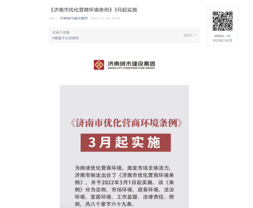 《濟南市優(yōu)化營商環(huán)境條例》(以下簡稱《條例》)于今年3月1日起施行,根據(jù)市國資委《關(guān)于開展優(yōu)化營商環(huán)境法治宣傳月活動的通知》要求,為貫徹實施好《條例》,持續(xù)優(yōu)化營商環(huán)境,3月4日-31日,集團及各子公司積極開展了優(yōu)化營商環(huán)境法治宣傳月活動?;顒悠陂g,集團在微信公眾號推送《<濟南市優(yōu)化營商環(huán)境條例>3月起實施》推文,同時通過電子屏投放、制作易拉寶等多種形式進行宣傳,不斷強化干部職工優(yōu)化營商環(huán)境的理念,營造良好輿論氛圍。