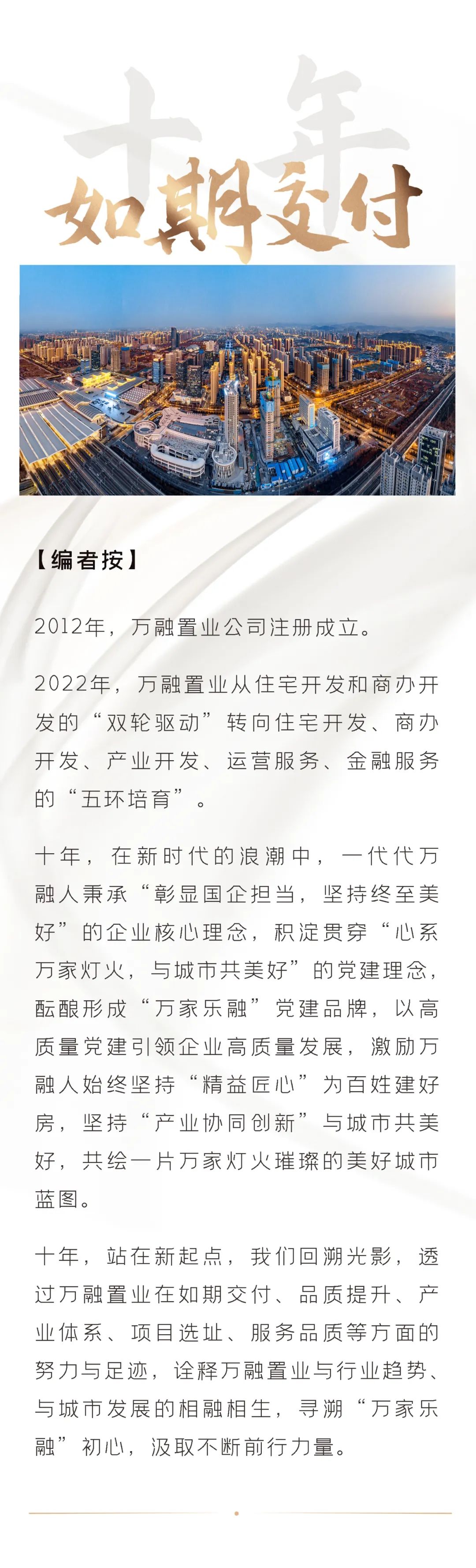 堅持人文關懷,追求營造高品質生活環(huán)境,讓城市品質融入萬家燈火,實現(xiàn)如期交付。在卓越如期交付的背后,是萬融置業(yè)品牌背書的實力護航和匠心堅持。