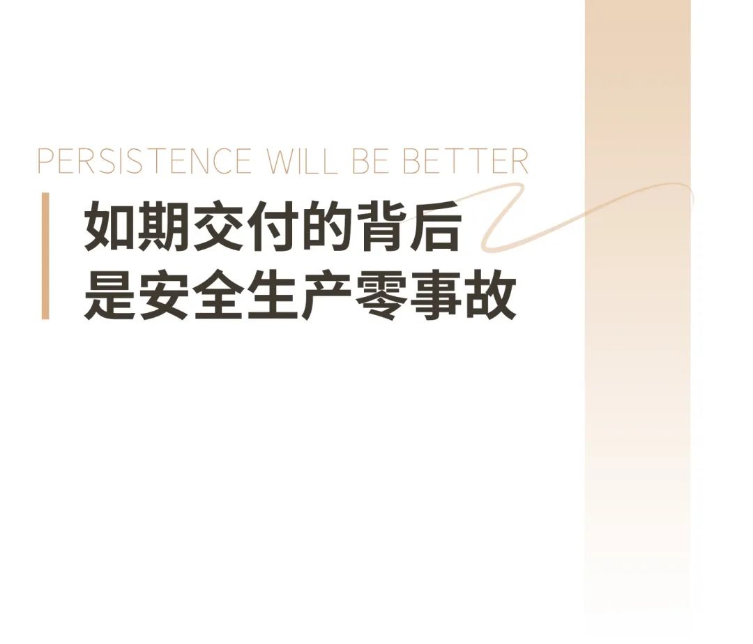 每個項目都要歷經上千個日夜的建設和精心打磨,始終秉持“安全第一,以人為本”的原則,充分發(fā)揮統(tǒng)籌組織和現(xiàn)場指揮能力,以安全生產為首要任務,整個建設周期達成安全生產零事故,為項目施工人員創(chuàng)造安全、健康的工作環(huán)境,維護現(xiàn)場人員的安全健康權益。通過嚴格的安全生產,確保產品品質,為業(yè)主建設安全、舒適、放心的家園。