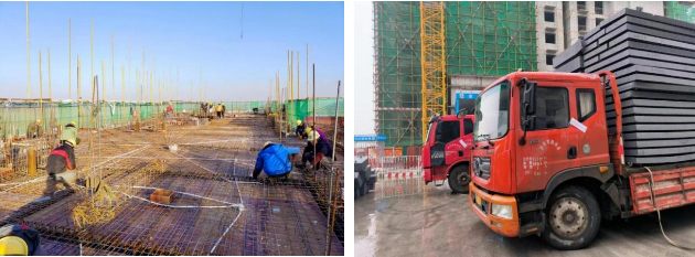 項目整體實行閉環(huán)管理,工人生活區(qū)位于項目內(nèi)部,從而保證項目封控期間各樓棟作業(yè)人員工種數(shù)量齊全,關(guān)鍵崗位不空缺,保障了項目生產(chǎn)“人力”。面對封控、材料供應(yīng)、運輸困難等問題,項目部提早謀劃,現(xiàn)場優(yōu)化布局,提前儲備關(guān)鍵物資,如鋼筋、預(yù)制構(gòu)件、保溫板等材料,同時物料進(jìn)出場進(jìn)行專班管理,提前報備、專人接送、封條張貼、專人盯守、過渡區(qū)消殺等管控流程配合嚴(yán)密,保障了項目生產(chǎn)“物力”。