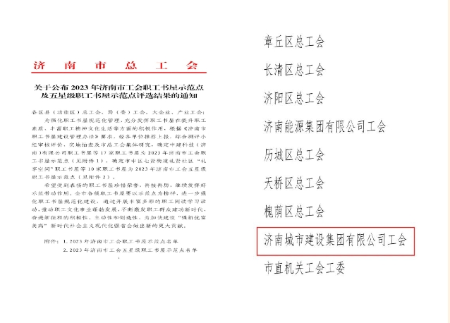 12月18日,濟(jì)南市總工會(huì)發(fā)布《關(guān)于公布2023年濟(jì)南市工會(huì)職工書(shū)屋示范點(diǎn)及五星級(jí)職工書(shū)屋示范點(diǎn)評(píng)選結(jié)果的通知》,濟(jì)南城市建設(shè)集團(tuán)有限公司職工書(shū)屋獲評(píng)2023年濟(jì)南市工會(huì)職工書(shū)屋示范點(diǎn)。
