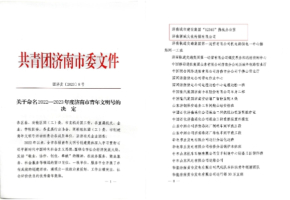 近日,共青團(tuán)濟(jì)南市委印發(fā)了《關(guān)于命名2022-2023年度濟(jì)南市青年文明號(hào)的決定》,集團(tuán)“12345”熱線辦公室、濟(jì)南新城文化傳媒有限公司兩家集體獲評(píng)2022-2023年度濟(jì)南市青年文明號(hào)。