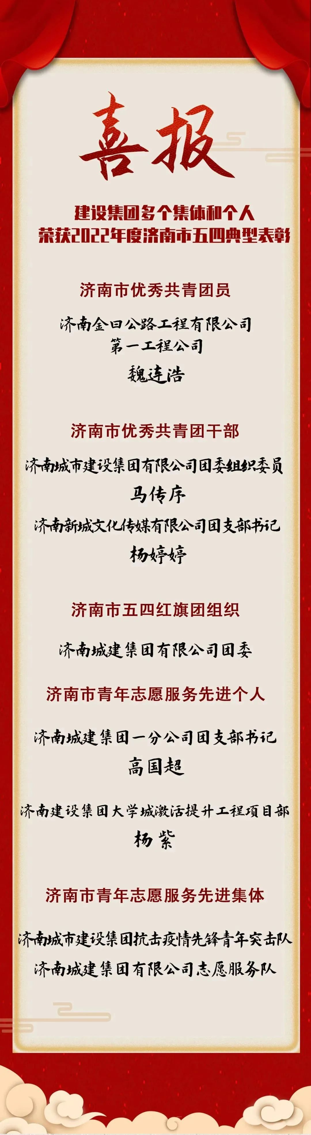 5月5日,共青團(tuán)濟(jì)南市委公布了《2022年度濟(jì)南市五四典型表?yè)P(yáng)通報(bào)》,建設(shè)集團(tuán)團(tuán)委所屬團(tuán)組織及團(tuán)員青年榮獲“濟(jì)南市優(yōu)秀共青團(tuán)員”“濟(jì)南市優(yōu)秀共青團(tuán)干部”“濟(jì)南市五四紅旗團(tuán)組織”“濟(jì)南市青年志愿服務(wù)先進(jìn)個(gè)人”“濟(jì)南市青年志愿服務(wù)先進(jìn)集體”等5項(xiàng)榮譽(yù)稱(chēng)號(hào)。