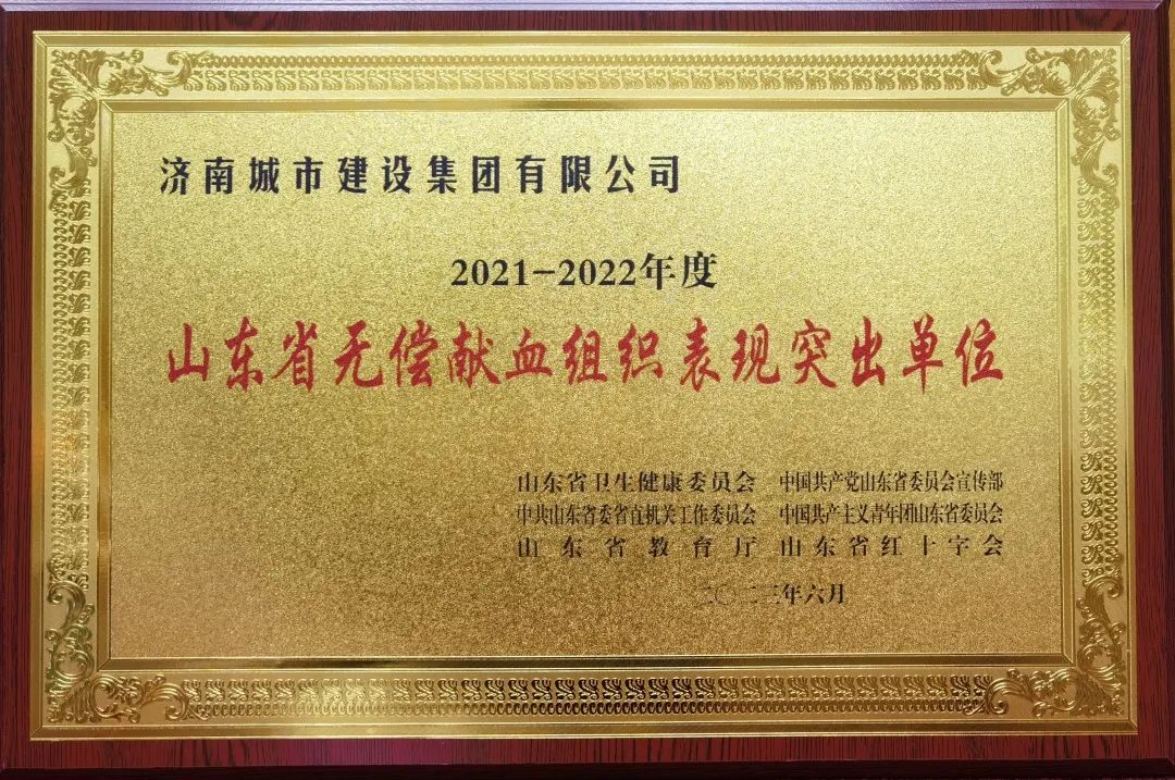 6月14日,值第二十個(gè)“世界獻(xiàn)血者日”,山東省衛(wèi)生健康委在濟(jì)南舉行山東省2023年世界獻(xiàn)血者日宣傳活動(dòng),對(duì)榮獲全國(guó)無(wú)償獻(xiàn)血表彰和全省無(wú)償獻(xiàn)血表?yè)P(yáng)的集體和個(gè)人頒發(fā)獎(jiǎng)牌和證書,濟(jì)南城市建設(shè)集團(tuán)榮獲“山東省無(wú)償獻(xiàn)血組織表現(xiàn)突出單位”榮譽(yù)稱號(hào)。