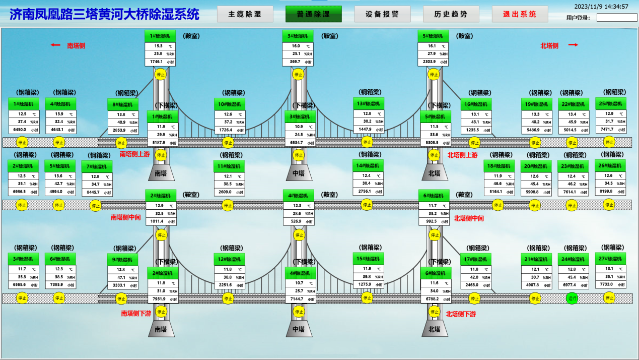 為保持橋梁結(jié)構(gòu)強度,防止鋼箱梁、內(nèi)部鋼架、主纜銹蝕,延長橋梁使用壽命,大橋安裝有3套主纜除濕系統(tǒng)、6套鞍室除濕系統(tǒng)、6套主塔除濕系統(tǒng)、27套鋼箱梁除濕機。所有除濕機都使用網(wǎng)格連接,通過邏輯控制系統(tǒng)實現(xiàn)數(shù)據(jù)共享、自動化除濕等任務(wù),時刻消除設(shè)備頑疾病害,提高行車安全系數(shù)。
