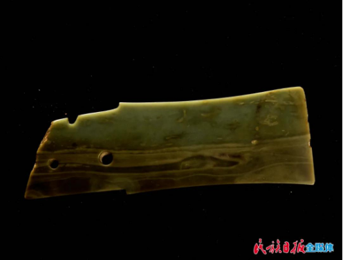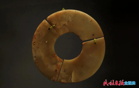 三聯(lián)璧是該館的重要藏品之一,這件器物屬于透閃石玉,整體呈扇面狀,由三件玉片連接而成,每一片都兩側(cè)對稱,兩端鉆孔,孔一面大一面小,呈喇叭狀,采用單面鉆孔法。此套三聯(lián)璧雖加工簡單,但琢工端莊大氣、拙樸豪放,它在最初以配飾形式出現(xiàn),到了齊家文化時期作為祭祀用的禮器,成為權(quán)勢與地位的象征。