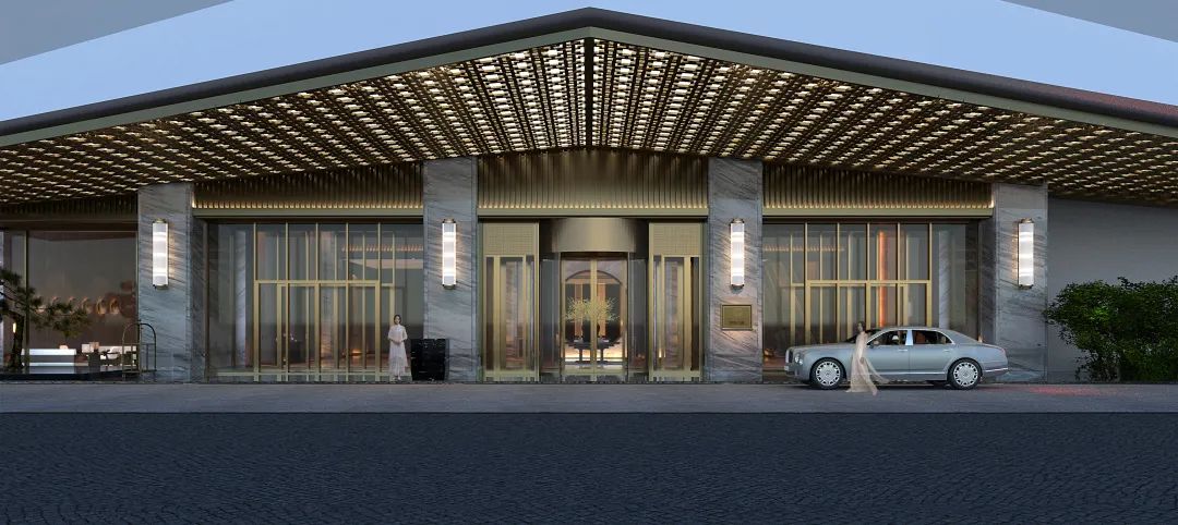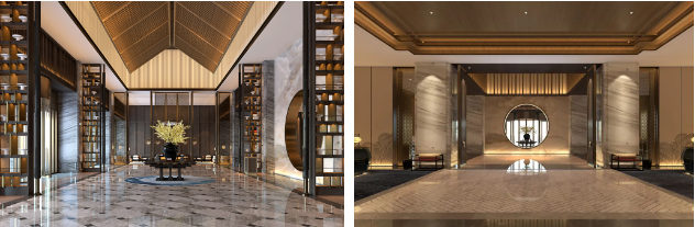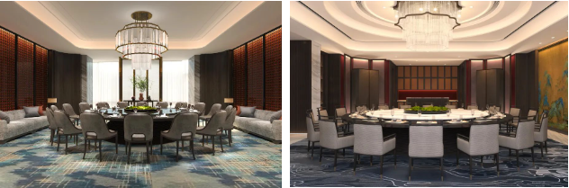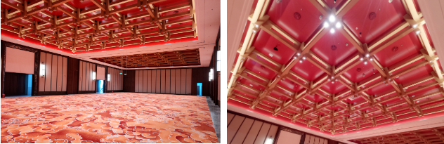 宴會廳天花的設(shè)計借鑒宋式屋架結(jié)構(gòu),通過現(xiàn)代設(shè)計手法進行簡化概括形成符合現(xiàn)代人審美的造型裝置藝術(shù)。